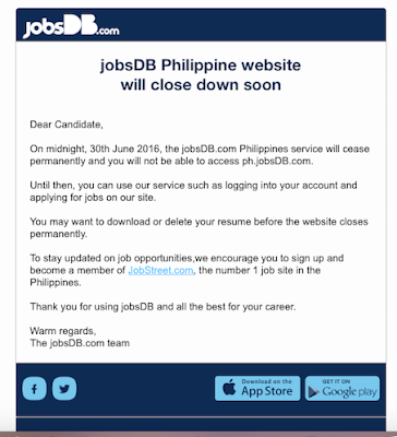 Reading more about the notice, I commend them that they point their jobseekers to the other job search engine, Jobstreet. I like that kind of attitude. It seems there was no bitterness (but of course, this is just me reading the notice I received).